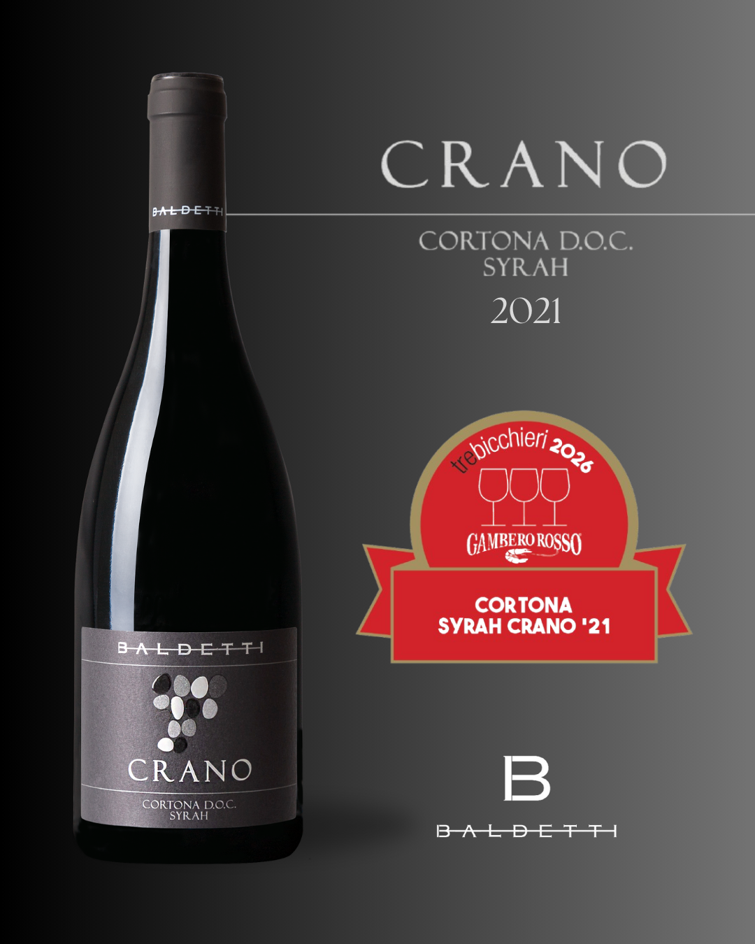 This is the fi rst straight Syrah ever produced in our Winery since 2008 and it is our flagship wine. The Cortona area established itself on the national and international wine scene as a perfect territory for the production of this vine, thanks to the particularly favorable climate conditions and the hard work of the producers.